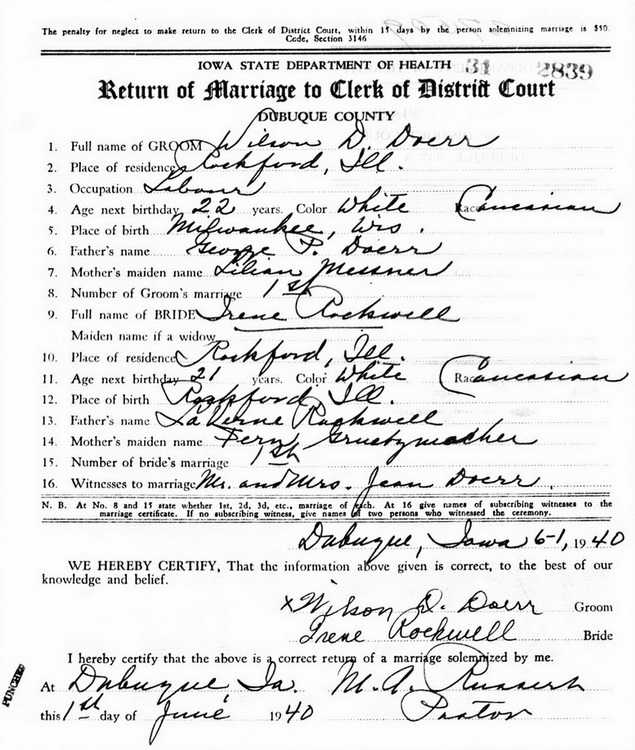 Wilson married Irene Rockwell in Dubuque, Iowa on 1