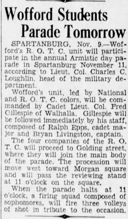 Spartanburg November 11, according to Lieut. Col. Charles C. Loughlin,