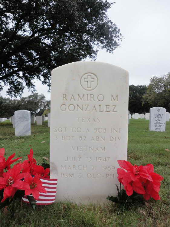 marker for Sgt Ramiro M. Gonzalez in Section V, Site 1285, Fort Sam