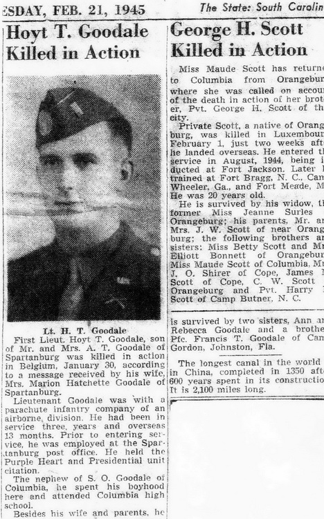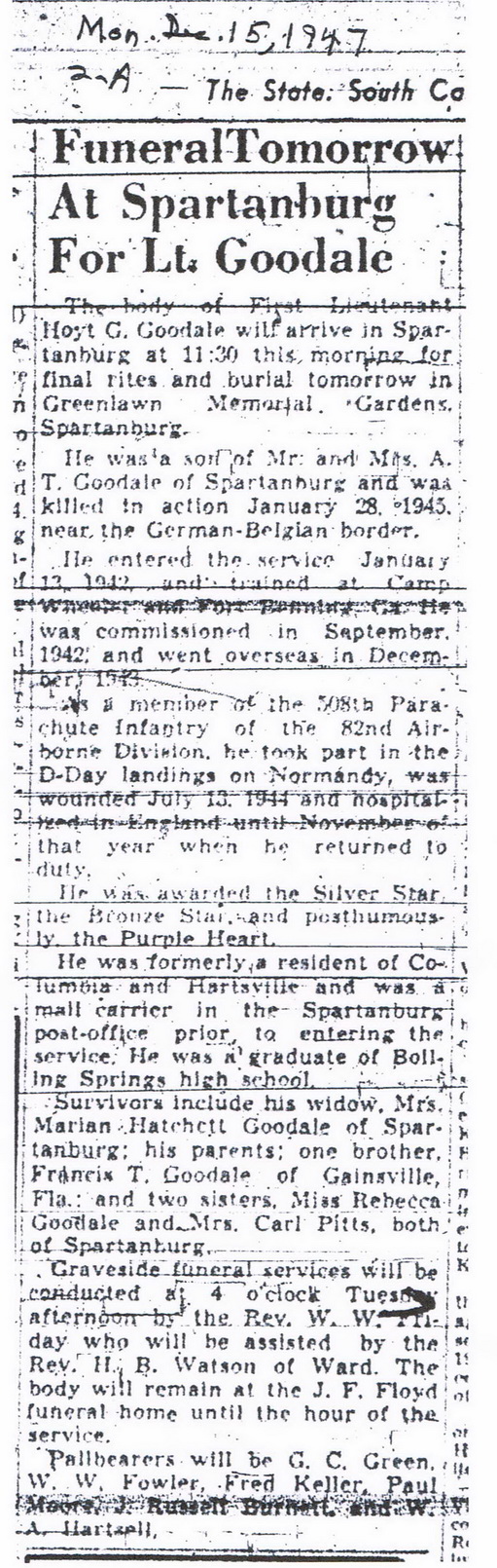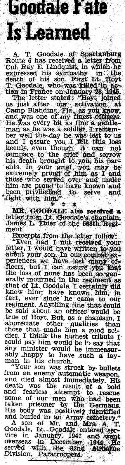 Killed In Action First Lieutenant Hoyt T. Goodale, son of Mr. and Mrs. A. T. Goodale of Spartanburg was killed in action in Belgium,