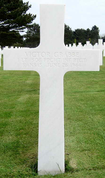 Grave marker for 1st Lieutenant Victor Grabbe at Plot F Row 15 Grave 39 in the Normandy American Cemetery and Memorial in Colleville-sur-Mer, France