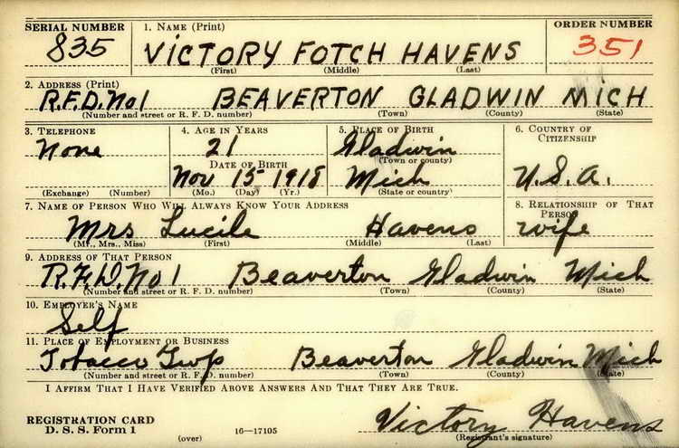 Pvt. Victory F. Havens was born in Buckeye township, Beaverton, on November 15, 1918, and most of his life was spent in Gladwin county. He was married to the former Lucile Brewer, of Beaverton, on March 7, 1939, and a son, Victory Ray, was born on August 3, 1942.