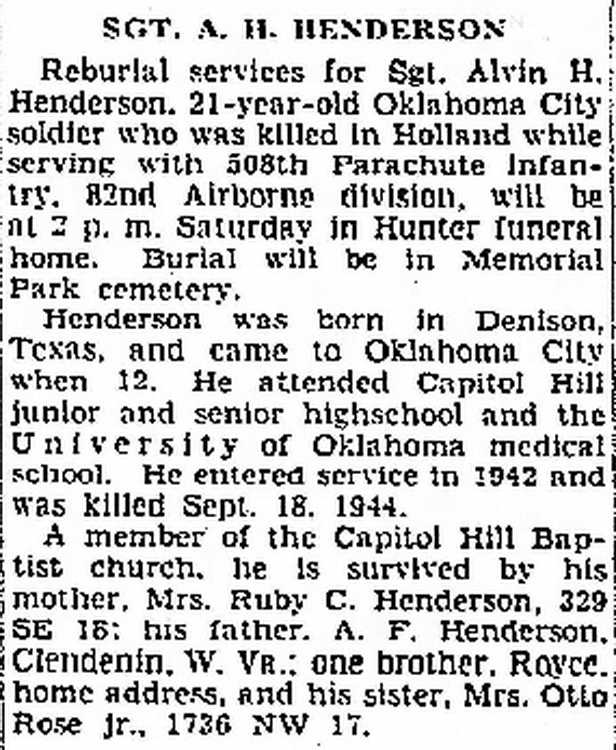 SSgt Henderson was killed in action on September 17, 1944