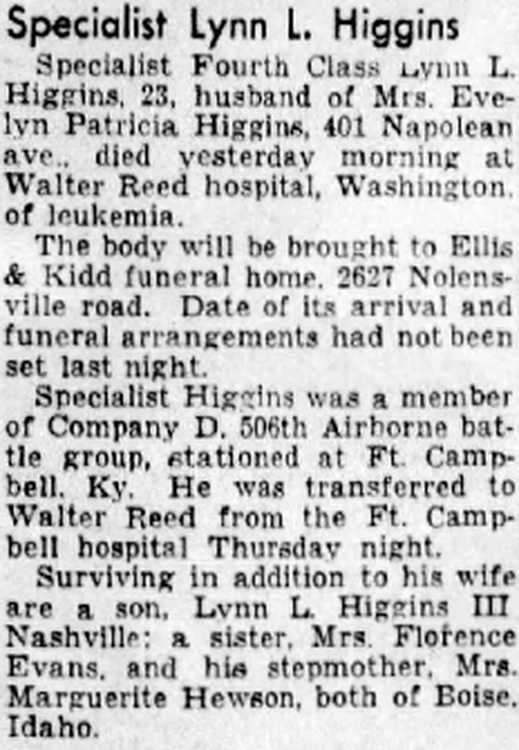 Surviving in addition to his wife are a son, Lvnn L. Higgins III Nashville; a sister. Mrs.