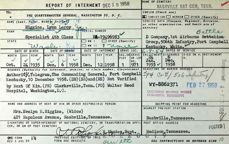 Application for a grave marker and resulting headstone for Spc-4 Lynn L. Higgins in Section 1, Site 971,