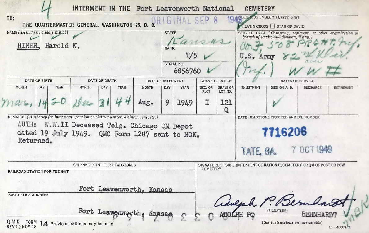 resulting grave marker for Tec/5 Harold K. Hiner in Section I, Site