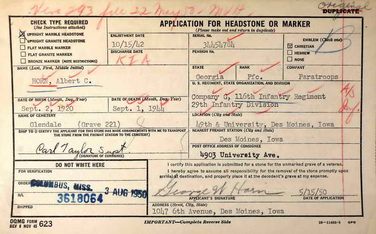 Application for a grave marker and resulting stone for Pfc Albert C. Horn in
