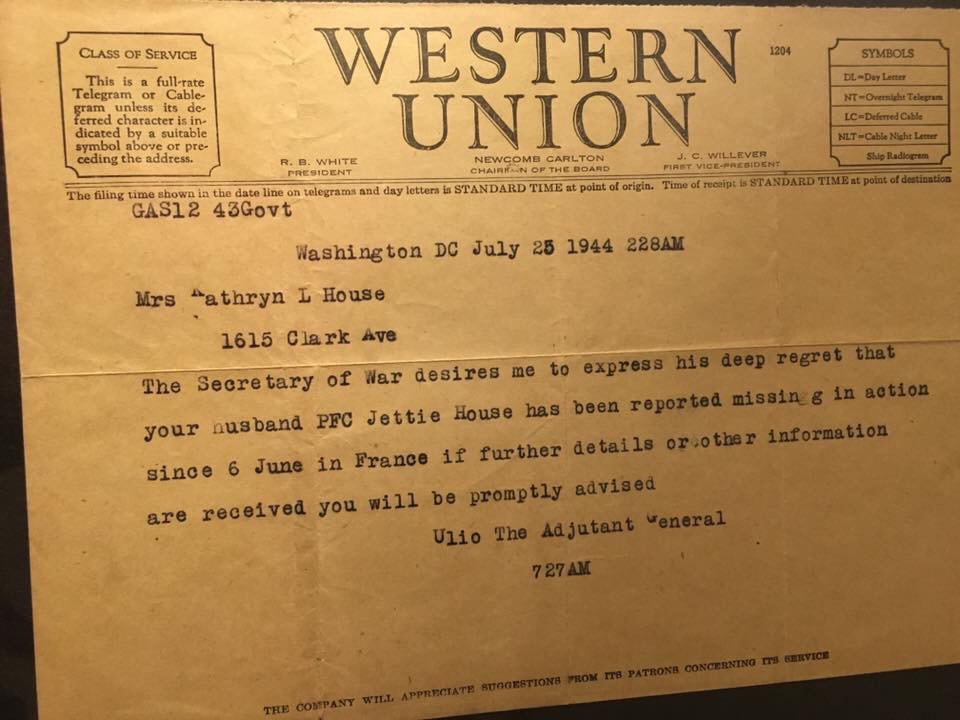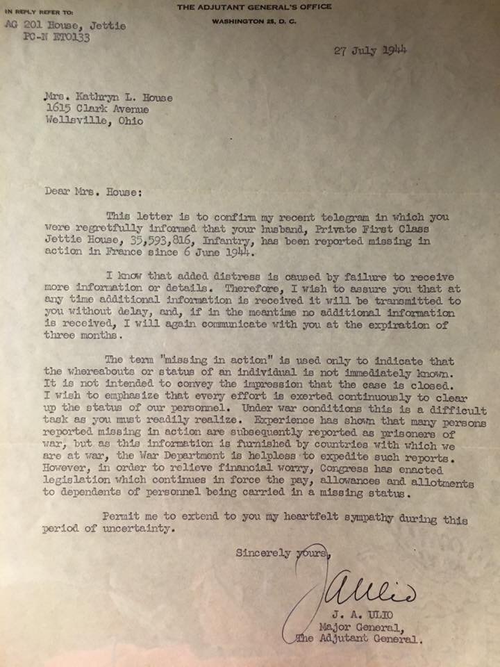 informed that your husband, Pfc Jettie House, 35,593,816, Infantry, has