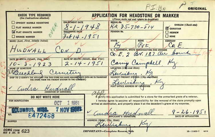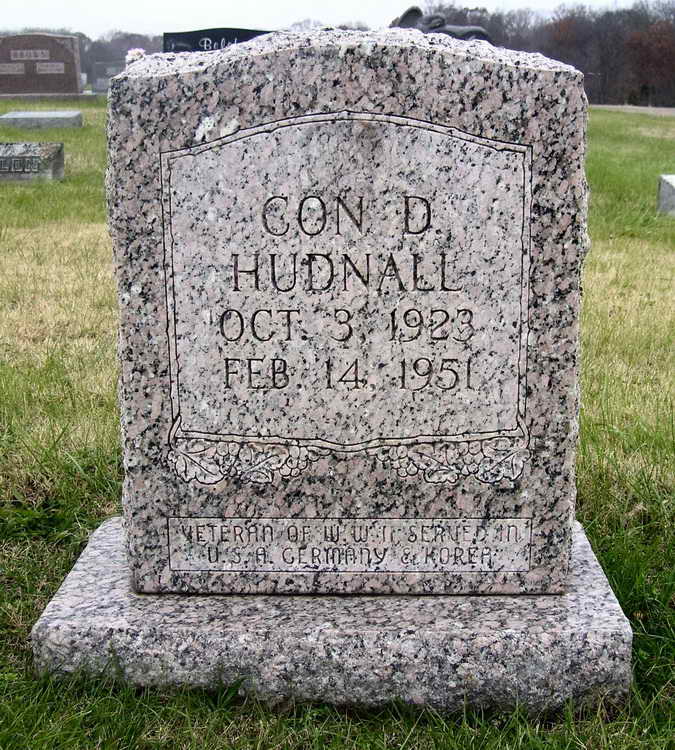 resulting granite headstone for Pvt. Con D. Hudnall in Beechland