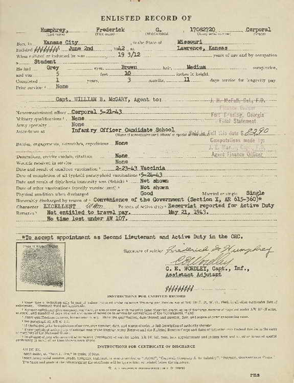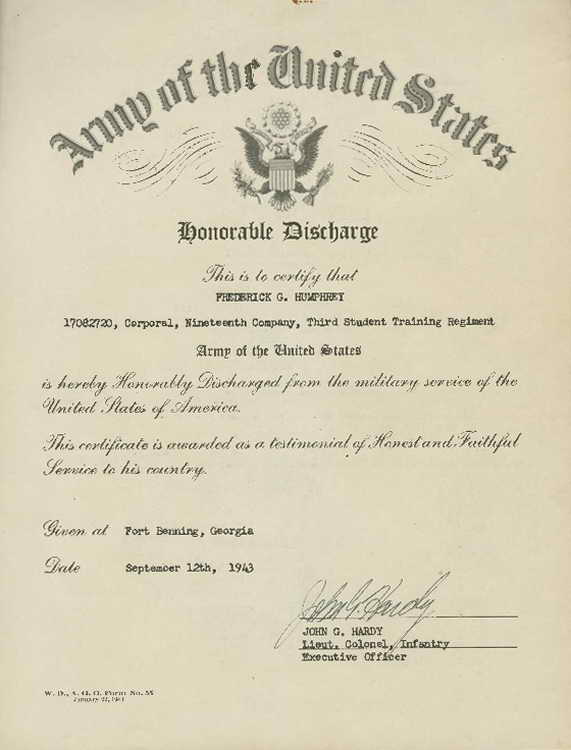 certificate for Cpl Frederick G. Humphrey as he entered OCS at Fort
