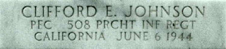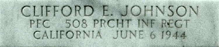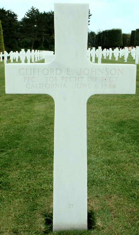 Grave marker for Pfc Clifford E. Johnson at Plot D Row 2 Grave 21 in the Normandy American Cemetery and Memorial in Colleville-sur-Mer, France