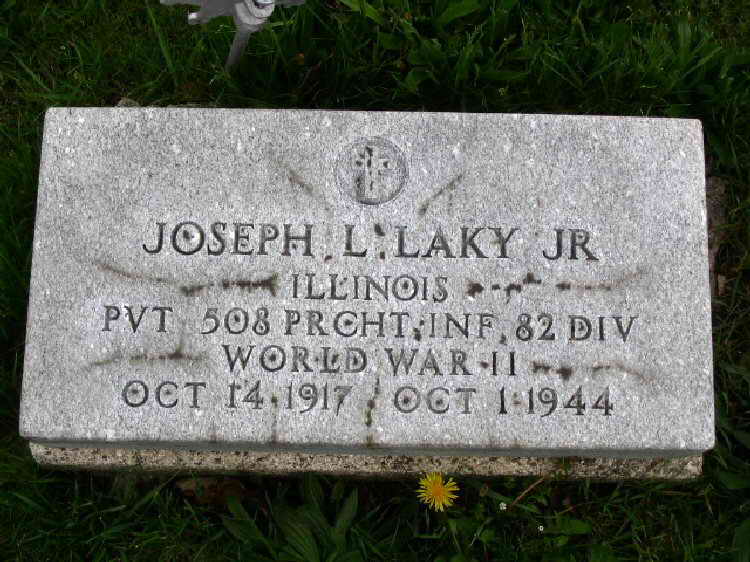 Grave marker for Pvt Joseph L. Laky, Jr in the Ottawa Avenue Cemetery, Ottawa (La Salle County), Illinois..