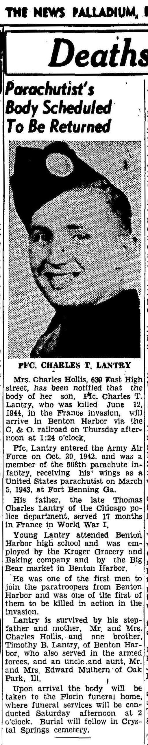 Pfc. Charles T. Lantry, Benton Harbor paratrooper, was killed in action