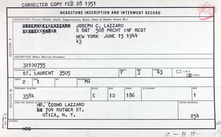 Grave marker for SSgt Joseph C. Lazzaro