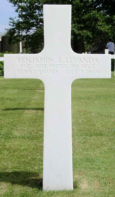 Grave marker for Pfc Benjamin J. Levanda at Plot C Row 11 Grave 15 in the Normandy American Cemetery and Memorial in Colleville-sur-Mer, France