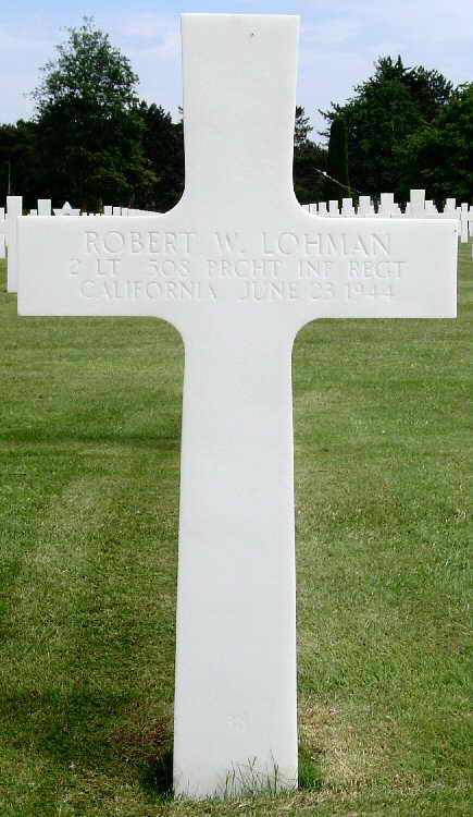 Grave marker for 2nd Lieutenant Robert W. Lohman at Plot E Row 2 Grave 38 in the Normandy American Cemetery and Memorial in Colleville-sur-Mer, France