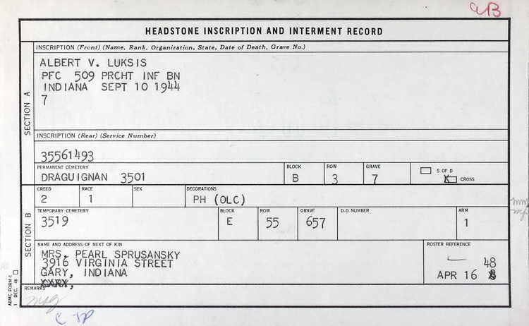 On 13 May 1943 Pvt Luksis was transferred to the Zone of Interior