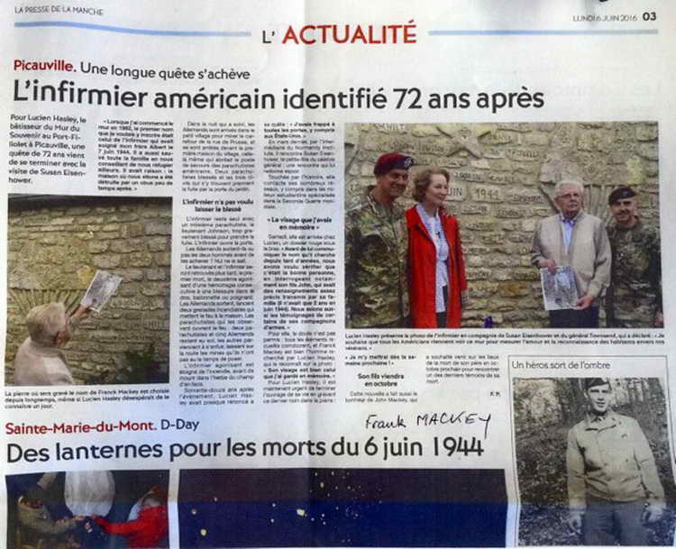 One day in Spring 2016, Mrs. Susan Eisenhower visiting Normandy with some other people, passed by Picauville. She stopped in front of the wall and talked with Lucien Hasley. The story of the murdered "medic " and of the stone still awaiting a name greatly upset her. She decided to take things into her own hands. Once back in the USA thanks to her several contacts, she did not take long to find a trail. She even made contact with the supposed son of the "medic" in order to check certain details. And the solution was found at Picauville with Lucien Hasley on June 4th, 2016. Mrs. Susan Eisenhower, accompanied by Generals Townsend and Ray, showed Lucien Hasley a photo of the medical orderly: his name was Frank Mackey.