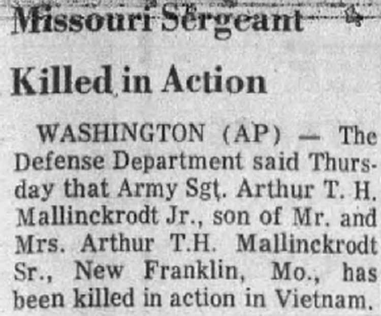 Mallinckrodt Sr., New Franklin, Mo., has been killed in action in