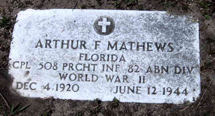 Grave marker for Cpl Arthur F. Mathews in the Wildwood Cemetery, Bartow (Polk County), Florida.