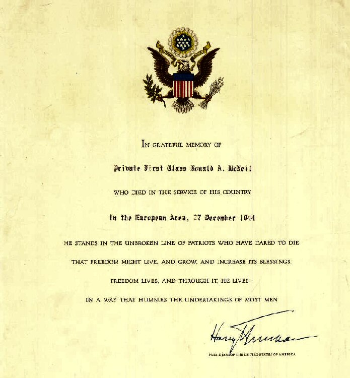 signed by President Harry Truman. Pfc McNeil was killed in action on