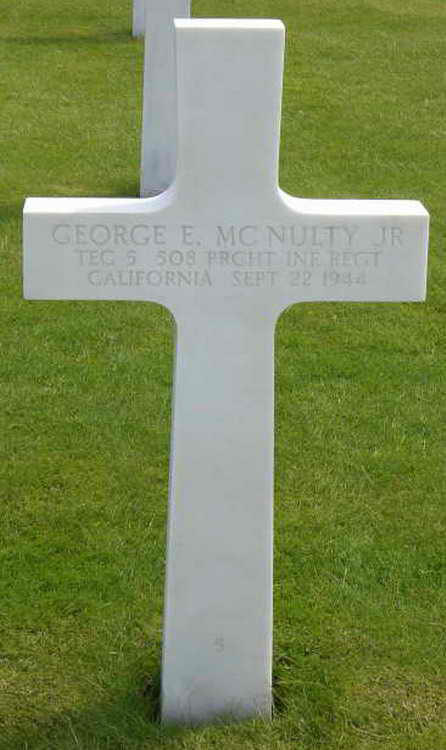 Grave marker for Tec/5 George E. McNulty at Plot B Row 24 Grave 5 in the Ardennes American Cemetery, Neupre, Belgium