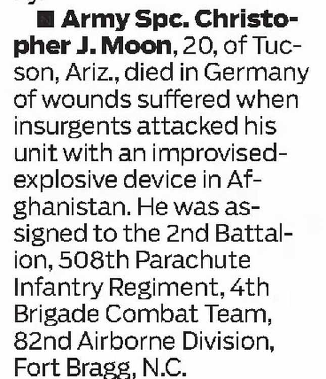 Spc Christopher J. Moon, 20, of Tucson, Ariz., died in Germany of