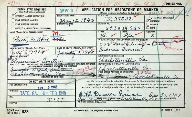 1945 near Thier du Mont, Belgium during the Battle of The Bulge. Pfc Price was