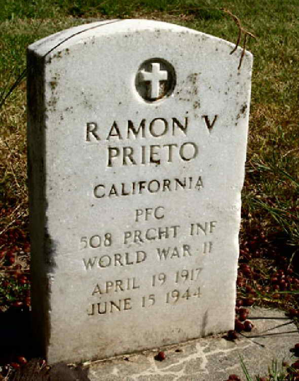 Grave marker for Pfc Ramon V. Prieto in Section D of the Santa Paula Cemetery, Santa Paula, Ventura County, California.