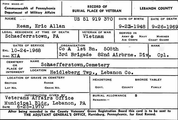 Record of Veteran Burial and grave marker for Cpl Eric A. Ream in Schaefferstown Cemetery,
