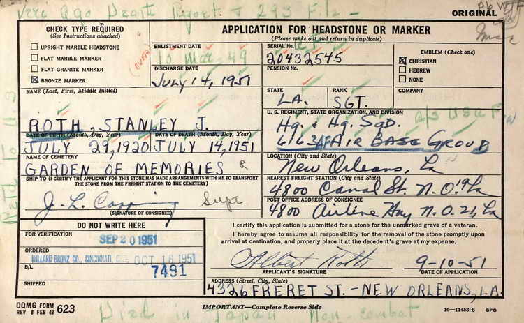 markers for Stanley J. Roth in Garden Of Memories, Metairie (Jefferson