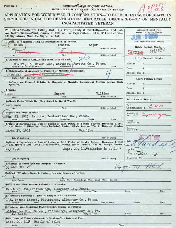 the Pennsylvania WWII Veterans Bonus that was due to her as next of kin.