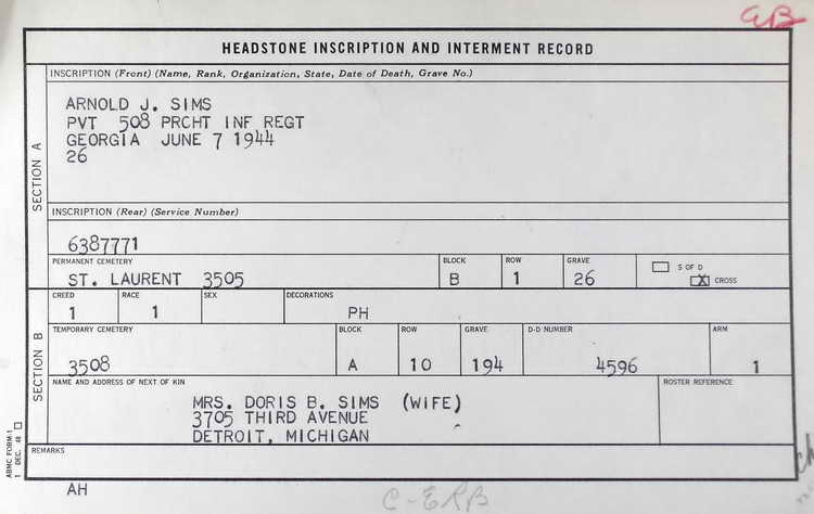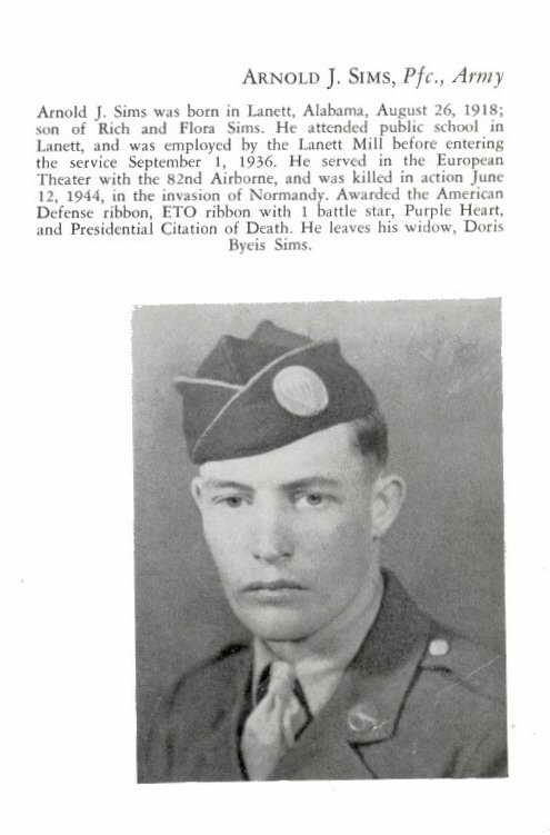 Arnold J. Sims, Pfc, ArmyArnold J. Sims was born in Lanett, Alabama, August 26,