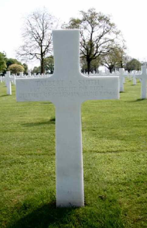 Grave marker for 1st Lt. Talbert A. Smith at Plot K Row 19 Grave 13 in Brittany American Cemetery, St. James, France.