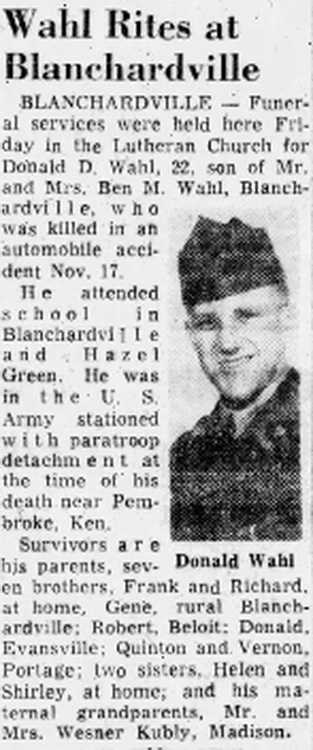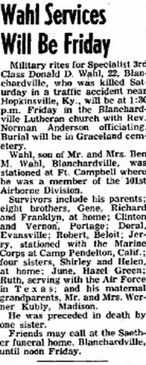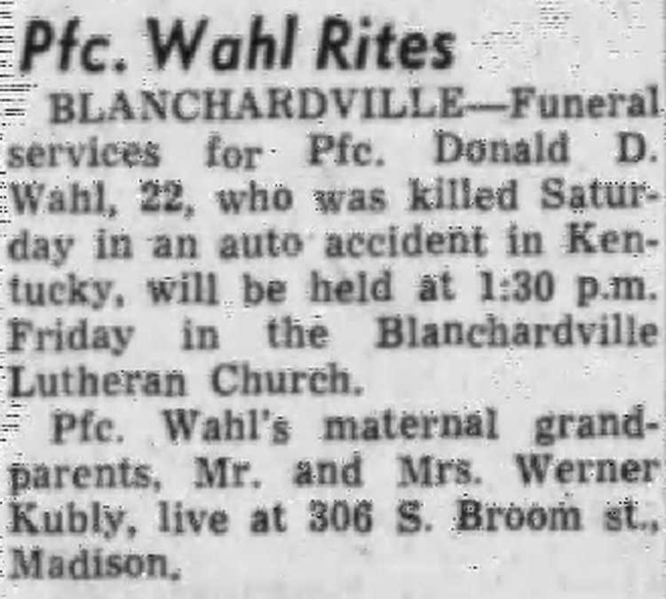 rites for Specialist 3rd Class Donald D. Wahl, 22, Blanchardville, who