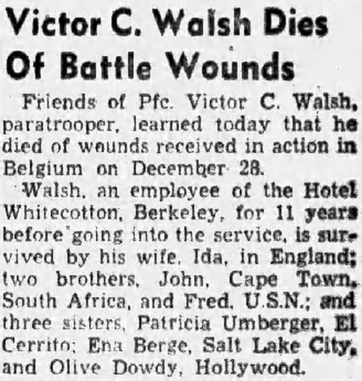 Of Battle Wounds Friends of Pfc. Victor C. Walsh, paratrooper, learned today that he died of wounds received in action in Belgium on December 28.