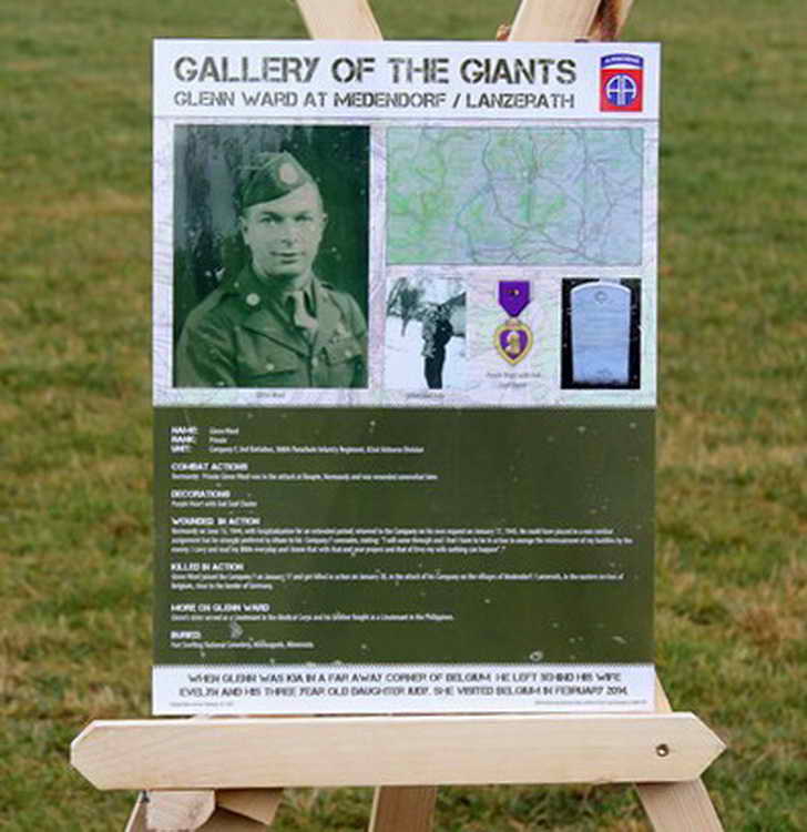 During Judy’s visit to Lanzerath, Glenn was inducted in the Gallery of the Giants, out of respect for his contribution in making this world into a better place for all of us, later generations. In the Gallery of the Giants Glenn is among comrades, many of whom made their Final Mile in the Battle of the Bulge.