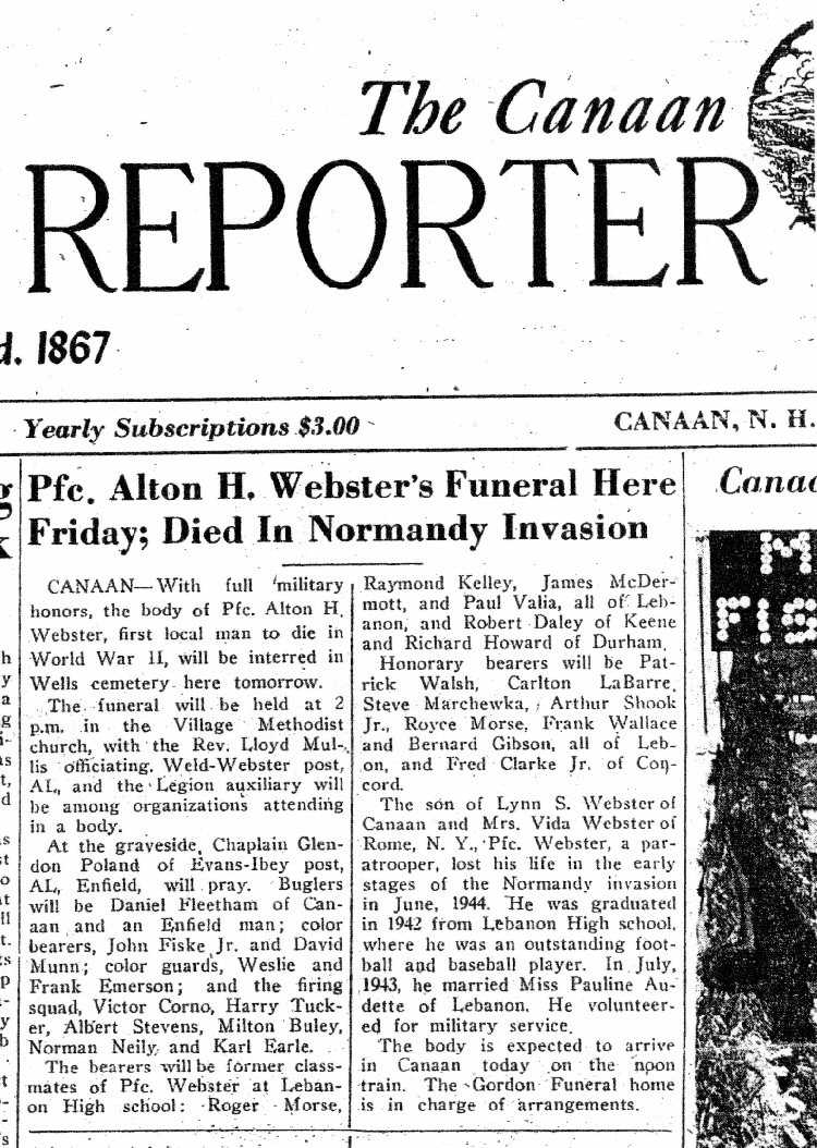 After the war ended, all families were given the option to have their loved ones' remains returned for interment in a local cemetery or to have them interred in a National Cemetery in the area where they fell. Alton Webster's parents opted to have him brought home. On April 7, 1949, the Canaan Reporter ran a front page article reprising the facts of his death and the plans for the funeral to be held the following day. [The timing of the article probably was due to the fact that the newspaper was not published on a daily basis.] |