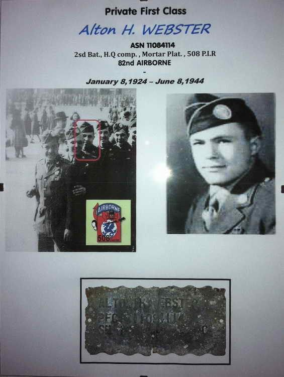 years tracking down where Alton Webster was buried. Irving also wrote: "... Alton, Zane [Schlemmer], and I were members of the 2nd Battalion's 81mm Mortar Platoon going into Normandy. Zane was our forward observer and later our platoon sergeant. I was a first gunner and Alton was my second gunner. He jumped directly behind me in our stick and he was the first one I saw on the ground after the jump. Alton and I were part of a 17-man group on our way to our objective during the early morning hours of D-Day when we were fired on by the Germans with automatic weapons as we approached a large farmhouse. Alton was hit in the chest and died the next day. He was seriously wounded and could not be moved so we got a 508th medic to patch him up."