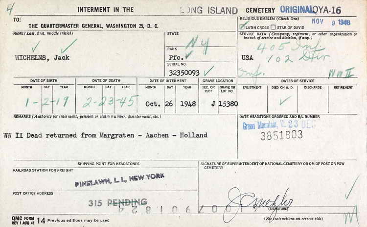 405th Infantry Regiment, 102nd Infantry Division when he was killed in
