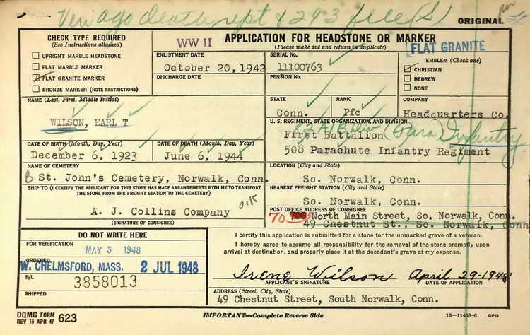 Application for a grave marker for Pfc Earl