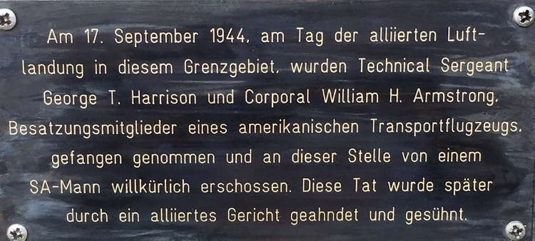 On 17 September 1944 on the day of the airlandings in this area, Technical Sergeant George T. Harrison and Corporal William H. Armstrong, crewmembers of an American transport,