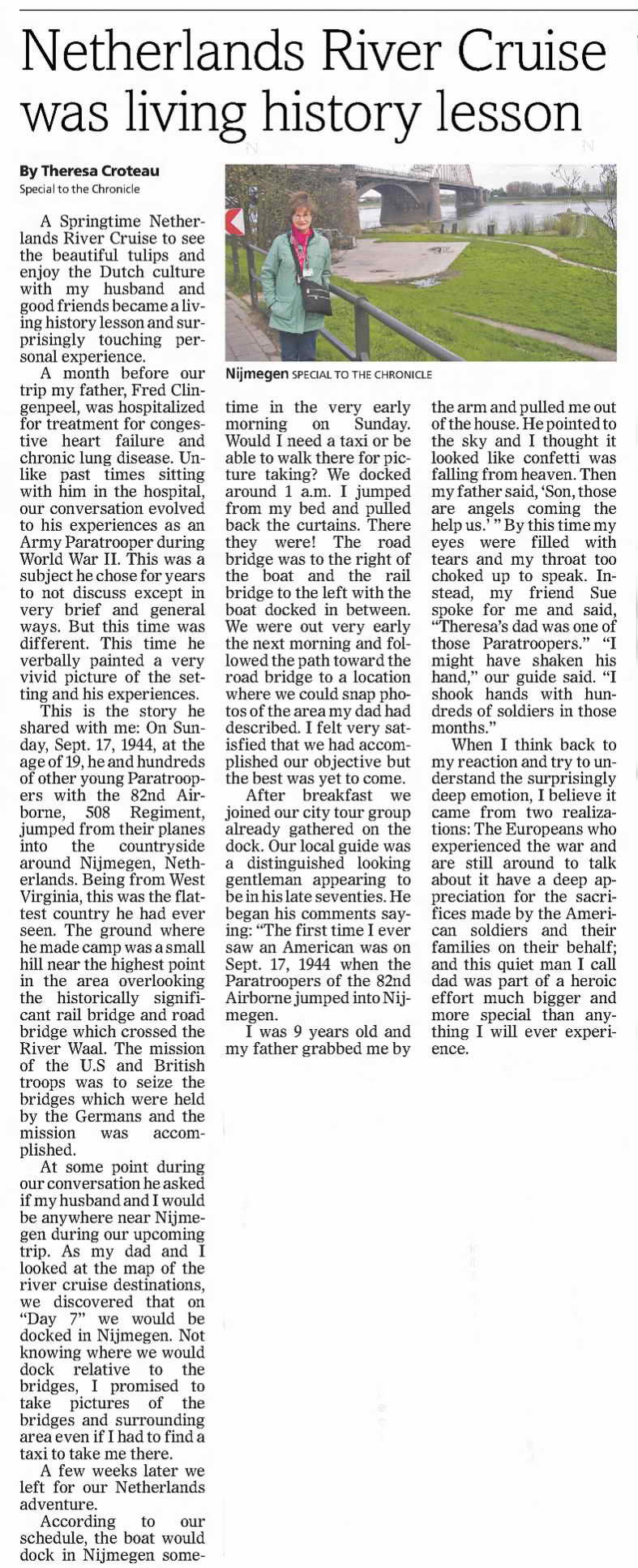 This is the story he shared with me: On Sunday, Sept. 17, 1944, at the age of 19, he and hundreds of other young Paratroopers with the 82nd Airborne, 508 Regiment, jumped from their planes into the countryside around Nijmegen, Netherlands. Being from West Virginia, this was the flattest country he had ever seen. The ground where he made camp was a small hill near the highest point in the area overlooking the historically significant rail bridge and road bridge which crossed the River Waal. The mission of the U.S. and British troops was to seize the bridges which were held by the Germans and the mission was accomplished.